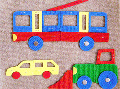Конструктор из ковролина на липучках. Содержит: игровое поле 25 х 30 см и набор деталей различной формы, позволяющий создавать различные виды транспортных средств. Развивает фантазию, творческое воображение, мелкую моторику, речь, образное мышление.