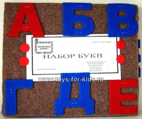 Коврик "Алфавит" представляет из себя набор из 33 буквы и коврика. Буквы посредством липучек прикрепляются к основе. Предназначен для обучения детей чтению.