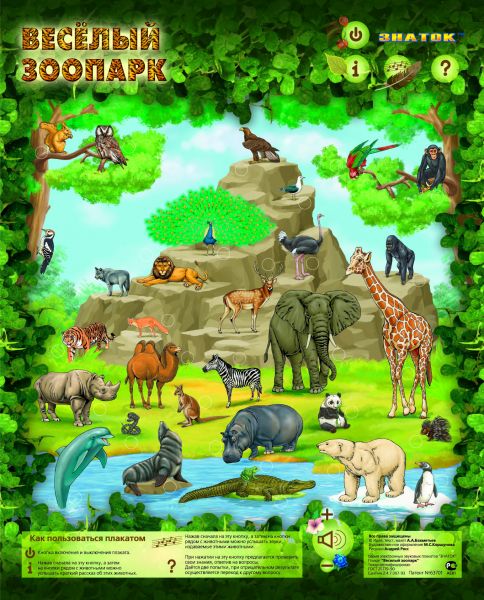 Электронный звуковой плакат "Весёлый зоопарк" поможет ребёнку увидеть, как выглядят различные дикие животные и услышать, какие звуки они издают.