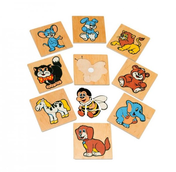 Набор из 10 планшетов размером 14,5х14,5 см с вкладышами дает 10 красочных изображений любимых детьми животных.