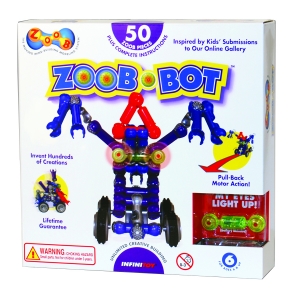 Набор включает в себя 50 основных деталей, 4 колеса, инерционный двигатель и заменяемую батарейку (для светящихся глаз).