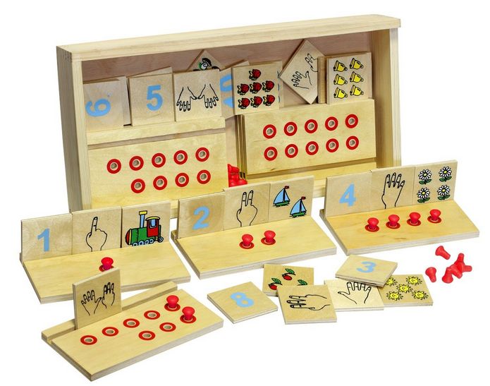 В составе набора 10 деревянных дощечек-подставок. По одной подставке для каждого числа от 1 до 10. На подставке есть прорезь для установки вкладышей (деревянные квадраты) и отверстия, в которые можно вставлять фишки (число отверстий от 1 до 10). Для каждой цифры предусмотрено 3 квадратных дощечки-вкладыша. На одной изображена сама цифра, на второй изображены руки с соответствующим количеством поднятых пальцев, на третьей - соответствующее цифре число одинаковых предметов.