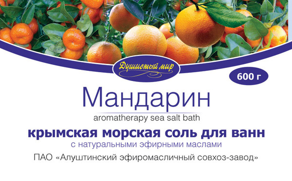 Состав:Соль морская кристаллическая из соляных озер Сакского залива Западного Крыма (акватория курорта Саки), натуральное эфирное масло Мандарина, продукт не содержит органических и неорганических добавок.